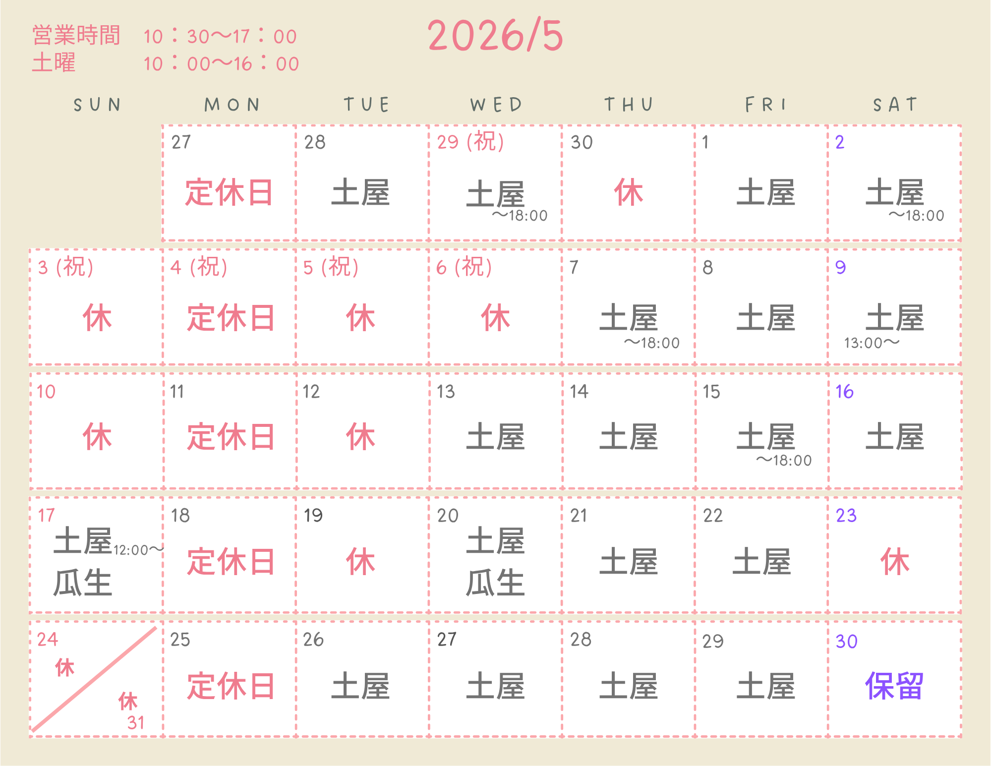 〜5月のスケジュール〜 毎週月曜定休の他、GW3日〜6日、12日(火)、19(火)、23(土)、24(日)、31(日)がお休みとなります。※17(日)は瓜生出勤です。◆5月以降、週末の予約につきましては事前確定ではなく、仮で希望日時をお伺いさせていただき、予定が確定次第、順次ご連絡させていただきます。皆様のご来店、心よりお待ちしております♡ Mie bonheur