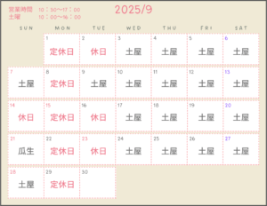 〜9月のスケジュール〜 毎週月曜定休の他、2(火)、14(日)、16(火)、23(火)がお休みとなります。※21(日)は瓜生出勤です。 皆様のご来店、心よりお待ちしております♡ Mie bonheur